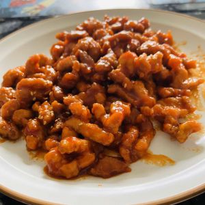酱汁烹煮好后,加入炸好的猪里脊肉混合翻炒