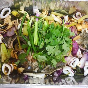 先把煮好的配菜铺底,再放鱼,放香菜和葱段,打大功告成!