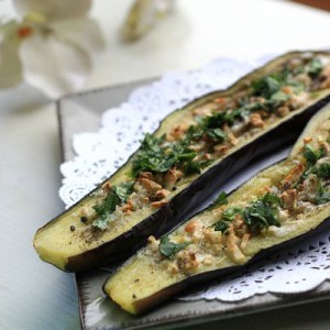 将蒜籽切碎与橄榄油拌匀,即成“蒜蓉橄榄油”香油,均匀的抹在茄子表面;