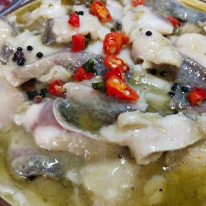 鱼片有个八分熟就可以,倒在我们刚才的鱼骨酸菜的上面,(余温会把鱼片烫熟)鱼片上放小米辣和花椒