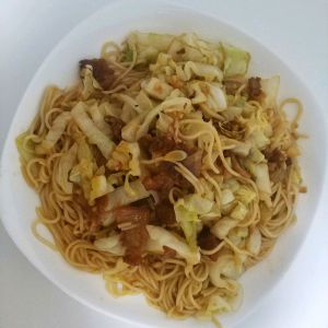 放入切好的圆白菜,加一点点水防止糊锅,一点点即可,炒至八成熟的时候加入准备好的面条。调成小火,加入味极鲜,盐,鸡精,慢慢翻炒一会,可以用筷子搅拌,更容易一些,出锅