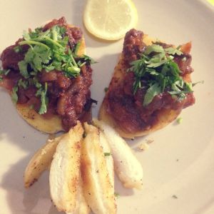 将馒头片上加上做好的西红柿牛腩,加少量香菜做点缀,加柠檬片做装饰!