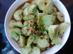 把切好的黄瓜、姜、蒜放入碗中,加入适量的盐、醋、葱以及适量的辣椒,拌匀即可