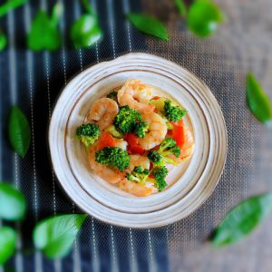 锅中留底油,炒香蒜片;倒入胡萝卜片翻炒片刻;再倒入西兰花继续翻炒,调入适量的盐和耗油翻炒炒匀;最后倒入滑好的虾仁,一起翻炒均匀,出锅装盘。