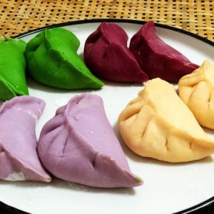 分别用160克左右的面粉,加入调好颜色的汁,揉成光滑面团……