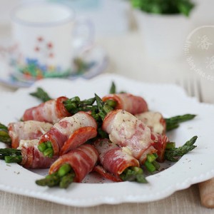 一条培根切成两半,芦笋也切成长5-6厘米长的段。用培根卷起芦笋,用签字串好。
