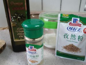 加入适量的橄榄油、盐、孜然粉和白胡椒粉,搅拌均匀。