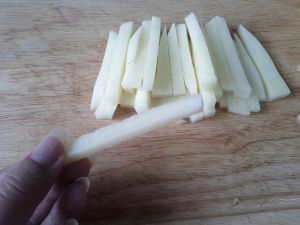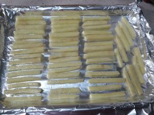 将烤盘铺上锡纸,将土豆条分开铺展。烤箱200度,烤制20分钟,中间翻一次面。