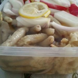 把洗干净剪掉指甲的鸡爪用料酒、少许盐码了一下,想去下腥。