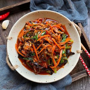 放入胡萝卜丝、木耳丝、青椒丝翻炒几下