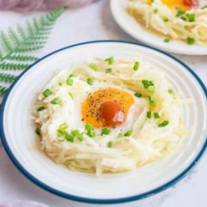 锅里放入适量的食用油,开小火。夹一些土豆丝放入锅里,整理成圆形,中间挖一个洞,打一个鸡蛋在土豆丝中间的洞里。
