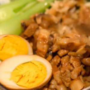 倒入五花肉和所有配料,(洋葱、香菇、三五颗冰糖、香叶、八角、桂皮、料酒三勺、酱油三勺),最后加一杯水。