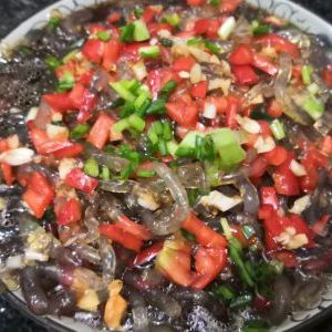 买回来的海蜇丝洗干净,切短一点。红椒切丁(怕辣,可祛除辣椒子),大蒜切碎,葱头切段。