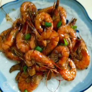 加入虾,煎熟,随后倒入老抽,酱油,勾芡的汤汁