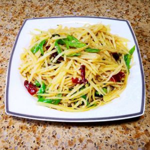 调大火,锅和油都非常热,放入土豆丝翻炒,然后立马倒入两勺醋,继续翻炒一分钟,然后放入青椒,继续翻炒两分钟。