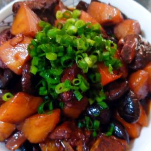 倒入泡好的干香菇以及香菇水 中小火炖20分钟 然后倒入土豆块