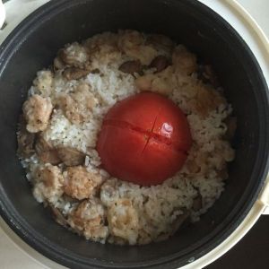 大米淘洗干净后加水。番茄洗净,顶部划十字刀口放到米饭中央。香肠切块放在番茄周边,虾仁我用的是前一天炸过的,也是铺在番茄周边。撒入胡椒碎,淋上橄榄油。打开电饭煲电源,等待就好啦!