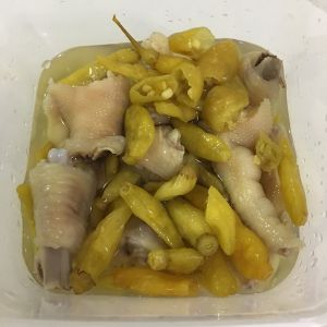 把泡椒放在保鲜盒中,水分没过鸡爪。
