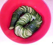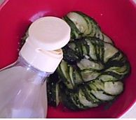 黄瓜放入碗中,撒入1茶匙盐抹匀黄瓜上,腌20分钟。