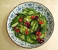 锅下油小火炒香剪圈的干辣椒,起锅时淋入1茶匙芝麻油激香。然后将炒香的干辣椒淋在黄瓜上即可(忘了放白熟芝麻)。