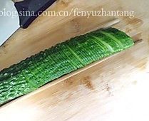 黄瓜洗净晾干表面的水分,放砧板上切去两头,在黄瓜两侧各放一根筷子夹住黄瓜,刀刃与筷子呈45度角斜着下刀将黄瓜切成片。切完一面后将黄瓜翻个身再用同样的方法切片。