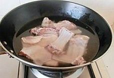 羊排切块,放入冷水锅里焯水,羊排变的发白即可
