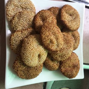 前面忘了拍照,把南瓜蒸熟捣碎和糯米粉粘米粉面粉糖混合,揉好后分成小剂子,搓圆压扁粘上芝麻
