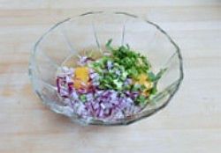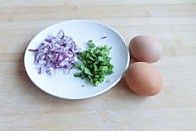 鸡蛋打撒,加入洋葱粒和葱花拌匀