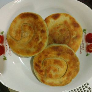 面团分成6小份~将一小份面团擀成长圆形后涂上拌匀后的油酥撒上适量(许多)多葱花