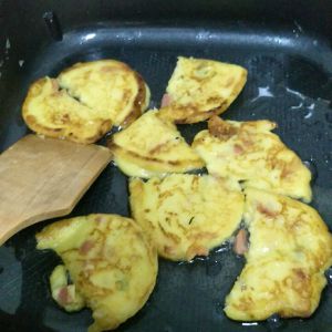 榨好土豆泥和面粉,鸡蛋,火腿勺拌。