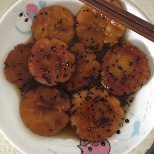 然后,锅里放一碗水和糖、芝麻,溶解及水开了后将煎好的南瓜饼放进去,煮四到八分钟,就可以上锅了