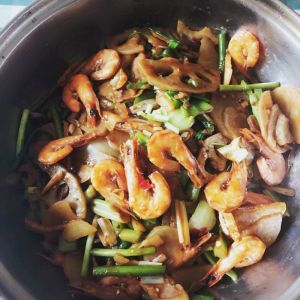 4)将之前的蔬菜,和虾一起倒入锅中炒开。加入半碗水,均匀炒开