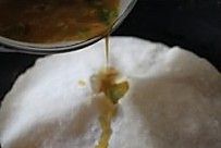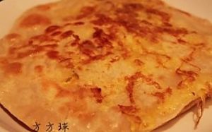 锅里加油,烧热,把饼放进去,小火烙,一会就会看到饼开始鼓包,不要管它,等鼓起很大一个包的时候就算好了。鸡蛋加葱末加少许盐搅匀,把鼓起的饼皮挑开,把鸡蛋液灌进去,漏点也没关系,一样粘附在饼上,煎出来也很好吃。