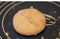 醒好的面团分成几个剂子。取其中一个面团,中间按出坑,然后加上油酥,像包包子一样把油酥包在里面,然后把面团擀成薄饼。