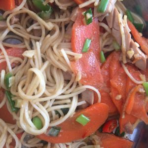 红萝卜去皮洗净,切片或者条,看个人喜欢。姜,蒜米,指天椒剁碎,葱花切小段备用。