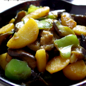 *锅里留少许油,爆香葱花蒜末,放入土豆,青椒,和茄子,调入生抽老抽白糖,加少量水,烧一会儿。