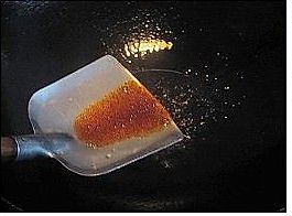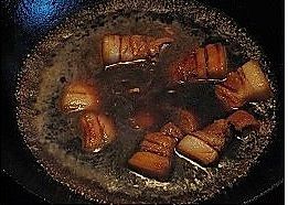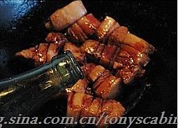 开小火加入五花肉翻炒;加入生抽和老抽翻炒;加入料酒再翻炒;