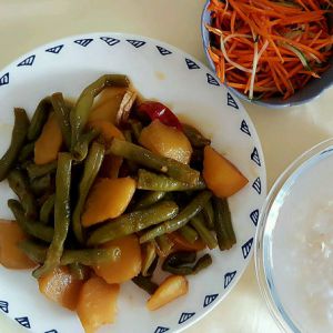 豆角炒至变色,将土豆倒入,铺在豆角上面不要翻动,否则土豆会碎掉。