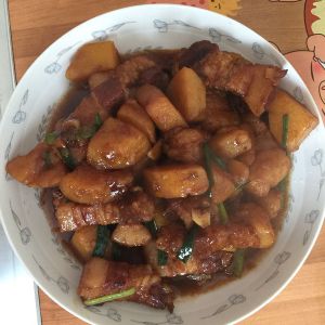 把准备好的土豆切成小方块,加入锅中跟肉一起焖