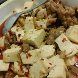 加豆腐一起翻炒,加水,煮两三分钟。加少许盐上锅。