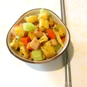 忘了拍图...锅中加油 先翻炒馒头丁 注意翻炒 避免粘锅 直至金黄色后 盛出待用 再加入少许油 少量葱花炝锅 然后先加入胡萝卜丁翻炒 直至微熟 加入火腿丁 及黄瓜丁 翻炒 加入适量盐 和生抽 翻炒 最后倒入馒头丁 混合翻炒一下 即可出锅了