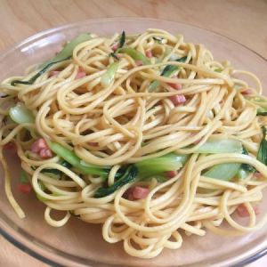 放入青菜翻炒至断生,然后把面条倒进锅中翻炒,出锅前加入适量的酱油和盐调味即可