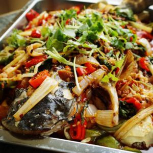 8.将成熟的烤鱼从烤箱中取出,铺在煮熟的蔬菜上,将炒好的调料汁均匀的倒在鱼身上,撒上香菜即可食用
