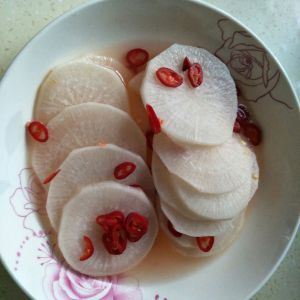 把萝卜,辣椒,盐,糖,米醋放在一起搅拌均匀。腌制一天即可。