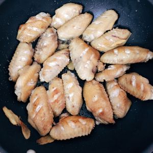 鸡翅先用刀斜划几下后用酱油腌制半个钟(比较入味),然后往不粘锅倒一点油(鸡皮煎着会出油)煎到两面发黄.
