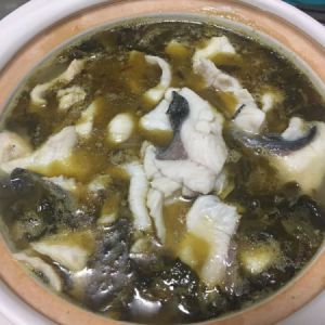 酸菜鱼汤放入预热过砂锅内,汤好鱼片放上面。花椒,红辣椒段,放鱼片上,浇热油二小勺。