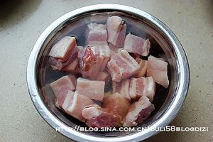 五花肉切块,放清水里浸泡10分钟,水中倒入小半杯的料酒去腥