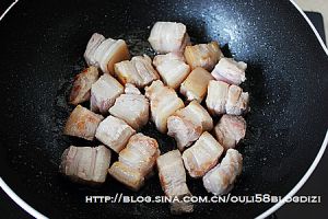 铁锅里放一点点油,很少的油即可,放入五花肉小火慢慢煸炒,可以看到锅里的油多了一点,这就是五花肉本身的油脂溶了出来,这样做可以减少油腻感