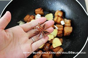 加入老抽,煸炒上色后,放入葱姜,加入八角一个