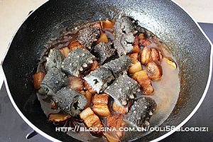 等到肉炖到五成熟熟时,把海参放进去,接着炖